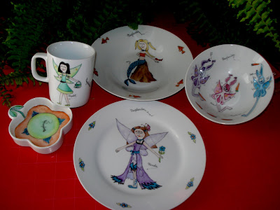Completando la serie Magilandia, esta tacita con haditas en los dos lados y un plato en forma de flor, para apoyar la tacita o para poner deliciosas galletitas